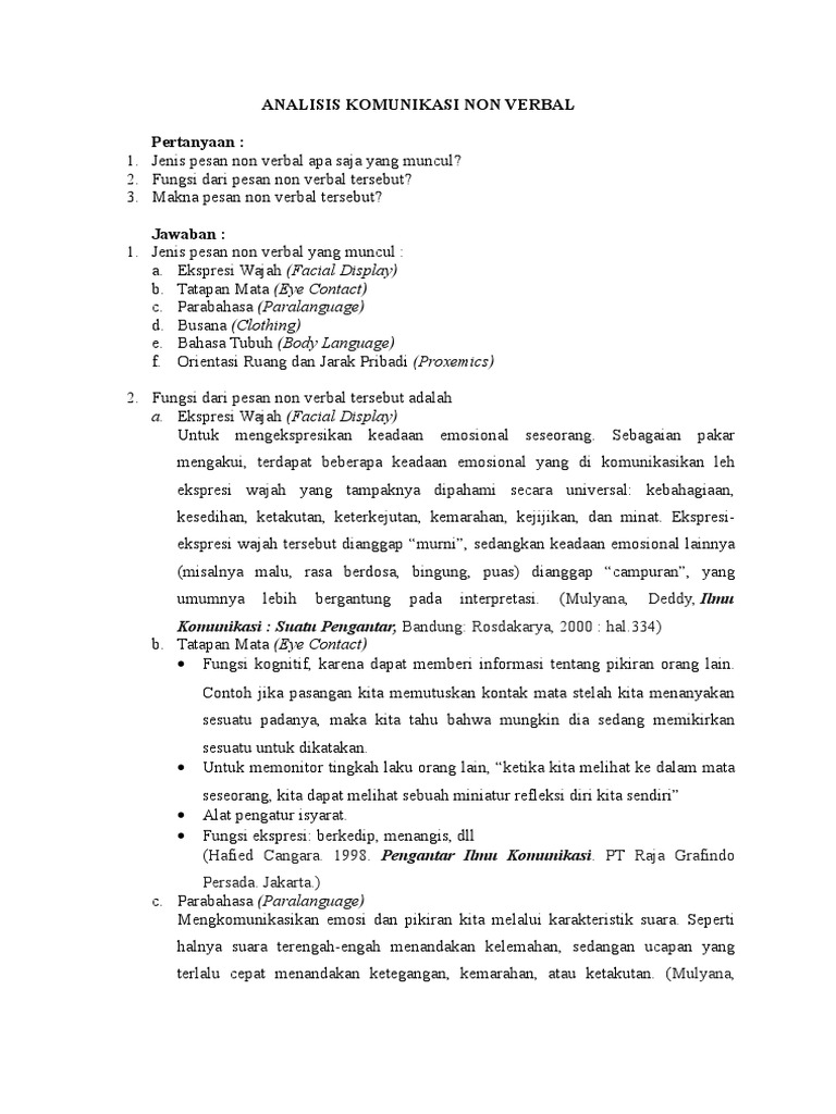 Analisis Komunikasi Non Verbal from imgv2-2-f.scribdassets.com Verbal yang merupakan hasil dari satu atau lebih gerakan. Komunikasi non verbal adalah proses pertukaran informasi menggunakan tingkah laku. Hal ini tentu berbeda dengan komunikasi verbal yang mentrasfer informasi melalui teks tertulis atau berbicara. Misalnya saja hanya dengan menggunakan gerak isyarat, bahasa tubuh, ekspresi wajah dan kontak mata, penggunaan objek seperti pakaian. Ekspresi wajah dan tatapan mata. Nah, untuk pembahasan lajut berikut kami sajikan sistem informasi mengenai komunikasi verbal dan. Sentuhan dapat berkomunikasi secara efektif dalam berbagai situasi. Anda pasti pernah memberikan semacam kode ke orang lain untuk pergi dari suatu tempat hanya menggunakan.