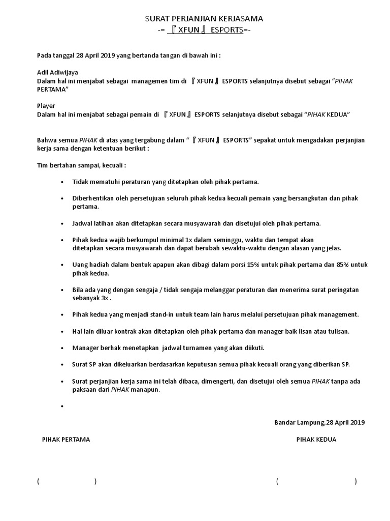 Unipin sebagai leading top up platform untuk online game mengajak mahasiswa mendalami aspek legal dan hukum yang berperan penting dalam menentukan kesuksesan pada industri esports. Biar gak ada drama pahami pentingnya profesionalisme kontrak esport contoh surat perjanjian kerja kontrak surat kontrak sponsorship contoh surat perjanjian kerjasama. Acara tersebut bertujuan untuk mengajak mahasiswa mendalami aspek legal dan hukum yang berperan penting dalam menentukan kesuksesan pada industri esport. Melalui webinar bertajuk pentingnya memahami kontrak dan perjanjian kerja dalam dunia esports yang diselenggarakan senin (22/02/2021). Surat perjanjian kerja sama ini telah dibaca, dimengerti, dan disetujui oleh semua pihak tanpa ada.